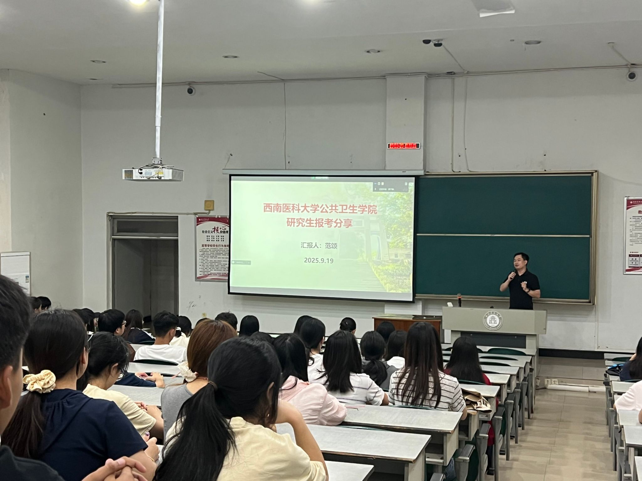 分享会上,范颂以“精准定位,科学备考”为主题,从多个维度为同学们进行了深入剖析。他首先介绍了全国公共卫生与预防医学学科的最新发展态势与我校硕士点的特色优势,详细解读了流行病与卫生统计学、劳动卫生与环境卫生学等专业方向的研究重点与师资力量。随后,他结合往年数据,科学分析了考研形势与竞争格局,提醒同学们既要认清挑战,也要坚定信心。