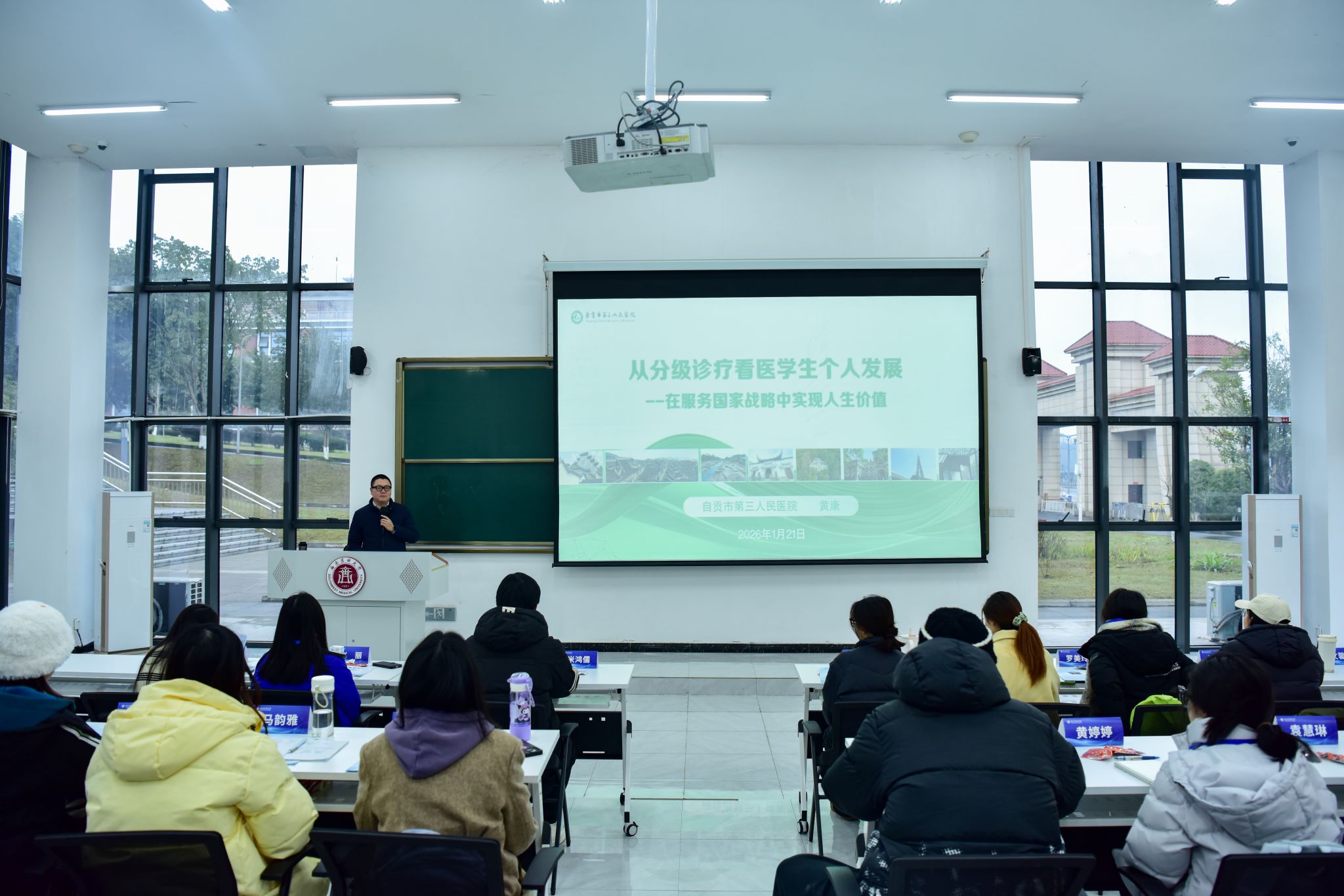 上午的专题讲座环节干货满满。自贡市第三人民医院党委书记黄康以《从分级诊疗看医学生个人发展——在服务国家战略中实现人生价值》为题,从分级诊疗国家战略部署切入,系统阐释医学生提升综合能力、在服务社会中践行人生价值的路径方法。成都市郫都区疾控中心主任黄小芳则结合一线工作经验,全面介绍疾控系统发展现状、岗位设置与职业需求,深入分析预防医学专业学生需具备的核心素养,梳理四大职业发展方向,为同学们的学业规划与就业选择提供了实用指导。