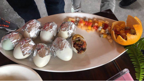 比赛现场气氛紧张而热烈,随着各位主厨手中翻飞的菜刀、锅铲,选手们个个绝活在手,创意满满,不一会儿,一盘盘各式各样的佳肴就呈现在了大家的眼前。每道菜肴从食材的搭配,烹饪方式的选择,摆盘的设计都颇为考究。主厨不仅有来自教学、科研、实验技术、管理一线的老师们,还有博士、处科级干部,真所谓“上得厅堂,下得厨房”。比赛过程中,还穿插了现场营养知识抢答环节,通过抢答,把健康的生活理念和饮食健康知识传递给现场的老师和同学们。