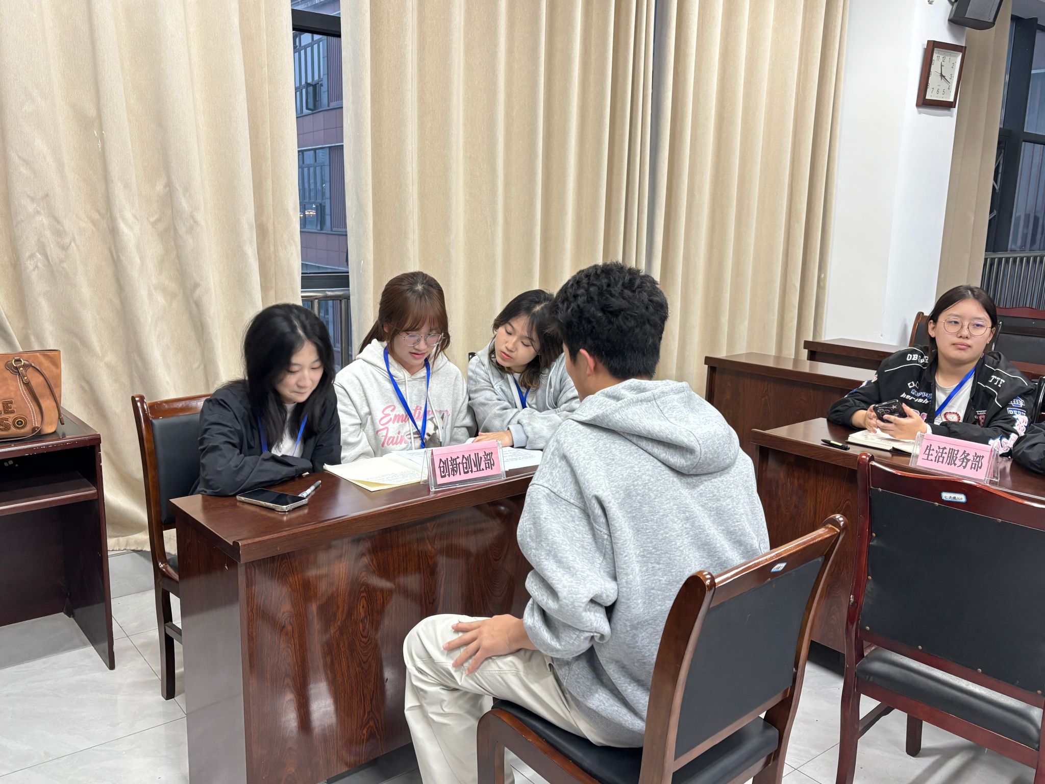面试过程中,应聘者按序登场,从容阐述个人基本情况、过往实践经历及对目标岗位的认知与工作设想,言语间尽显担当精神与服务热情。面对评委围绕团队协作、应急处理、学业与工作平衡等实际问题的提问,应聘者沉着应答、思路清晰,充分展现了良好的沟通能力与综合素养。评委团秉持公平、公正、公开原则,细致考察应聘者的能力潜力与岗位适配度,认真记录、严谨评议,后续将结合面试表现确定最终录用名单,