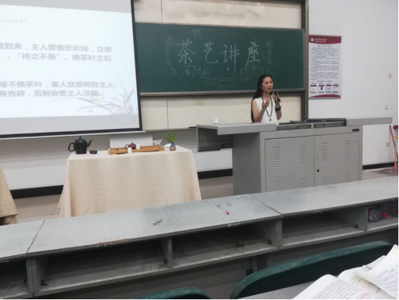 肖老师为同学们讲解了中国茶的前世今生,特别强调中国茶礼成为国礼,在中国外交中起到的积极作用。随后,两位茶艺老师在悠扬的丝竹声中娴熟地展示了传统的中国茶艺,肖老师对中国茶艺的基本礼仪进行了详细的讲解。