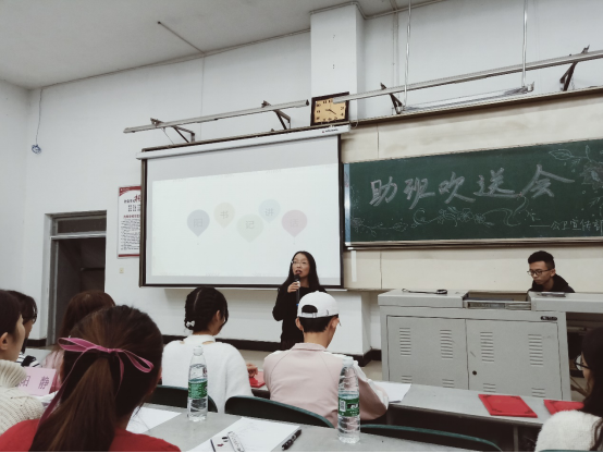 最后由阳书记为本次欢送会做总结。她对2017级助班工作给予了充分的肯定和表扬,并且希望2018级助班能以学长学姐们为榜样,做好老师的助手,当好老师和同学们之间的桥梁,帮助2018级同学尽快适应大学生活,将“助班”这份温暖传递下去。