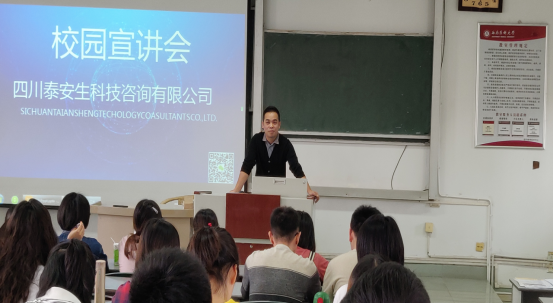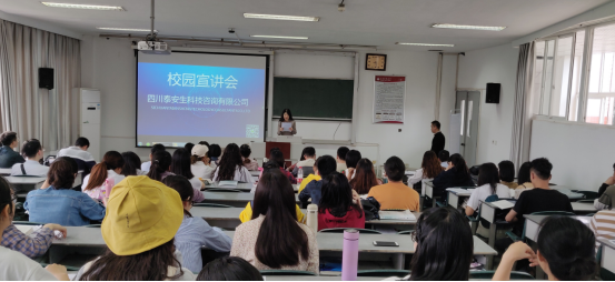 彭丽冰老师首先向各位负责人的到来表示欢迎和感谢,并针对当前的就业形势与就业政策,对公司毕业生的就业情况作了简单的介绍;随后,四川泰安生科技咨询有限公司职卫检测部部长陈冠侯从公司概况、企业文化、企业员工培养模式、企业目前的发展状况及发展前景以及公司所需人才与同学们作了详尽的分享。