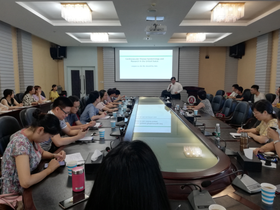 院长贾红介绍了刘隆健教授的学历背景和研究方向。随后,刘隆健教授以“Cardiovascular Disease Epidemiology and Research in the United States”为题,分享了在美国开展心血管疾病研究所取得的成果;从研究背景和意义、整体框架构建等方面入手,探讨开展心血管疾病流行病学研究的必要性;肥胖与CVD之间潜在的病理生理机制,以及肥胖在美国的流行现状;详细介绍了研究团队开展的两项大型心血管疾病队列研究——“MESA”和“EHRs”。