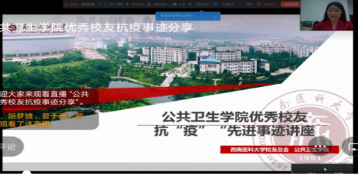 讲座中,2009级优秀校友、眉山市仁寿县疾病预防控制中心卫生科副科长范文成讲述了自己奔赴武汉洪山区,与当地疾控中心一起抗击疫情的感人事迹;2009级优秀校友,广元市疾病预防控制中心传染病防制所罗兴讲述了其作为卫生系统留京值守队伍的一员,坚守入境人员防控战线的感人事迹;2008级优秀校友、泸州市疾病预防控制中心急性传染病与免疫规划科蔡金桦讲述了其作为一名普通基层人员,抗击疫情的感人事迹。