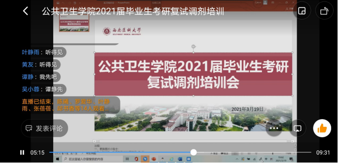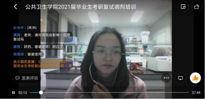 培训会上,两位老师从考研复试准备、调剂渠道、调剂方式、调剂流程及注意事项等几个方面给同学进行详细讲解,并重点向同学们介绍了调剂的渠道、流程、技巧、调剂复试,提醒同学注意复试时间节点,重点关注扩招院校调剂信息动态。最后提问环节,吴小蓉对同学的提出的问题进行了一对一的解答说明。